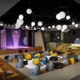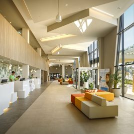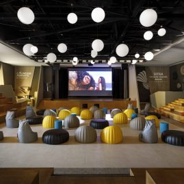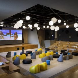 The complex is divided into more than 40 multi-zones that can be individually monitored and managed in various configurations, including the central mall building, the pool and surrounding complex, as well as the commercial center, movie theater, sports complex, and digital gaming area. Audio is distributed throughout the complex via a Dante network, with a Biamp Tesira DSP sending to over 100 loudspeakers from Community, TOA, and Apart. The system is powered by just two Linea Research 8-channel amplifiers – one 88C10 and one 88C6, both Dante-enabled. As Stubičan observes, the Linea amps particularly shine in the movie theater, where they power a Community IV6 system.